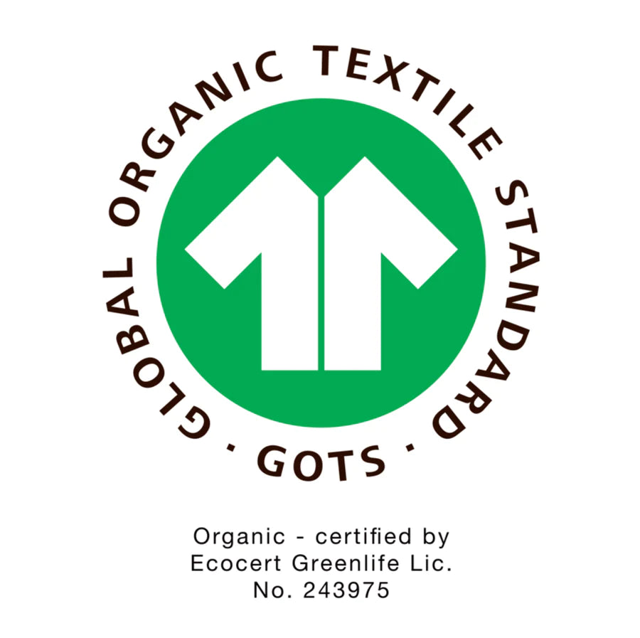 GOTS står for Global Organic Textile Standard og er verdens førende certificeringsstandard for økologiske tekstiler, hvor der tages hensyn til både økologiske og sociale forhold. GOTS omfatter hvert enkelt trin i en produktionsproces – fra ekstilfibrene til det færdige stykke tøj. Denne certificering er vores garanti for, at vores produkter er ansvarligt produceret og lavet af 100% økologiske fibre.
